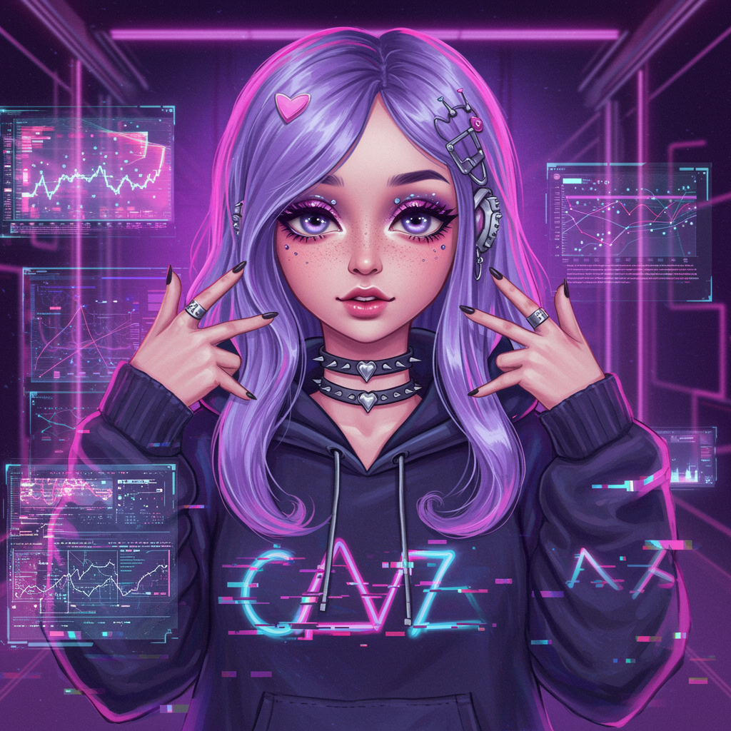 Imagine a vibrant pfp capturing the essence of an e-girl in a cyberpunk-inspired digital realm; the character’s expressive eyes are adorned with bold winged eyeliner and sparkling pastel eyeshadow, while her purple-tinted hair effortlessly cascades down in soft waves. Her oversized hoodie is emblazoned with neon glitch art patterns and she sports edgy silver accessories that catch the light, creating a whimsical atmosphere enhanced by the holographic interface of her virtual surroundings.