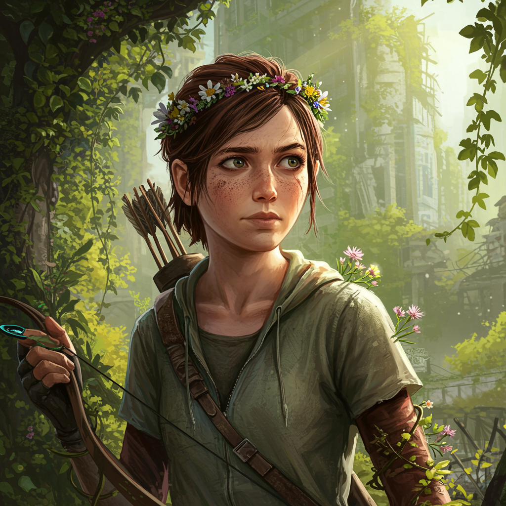 "Create an imaginative profile picture capturing an alternate-universe Ellie Williams exploring a vibrant, post-apocalyptic urban jungle; her expression embodies resilience and hope amidst sprawling vines and sunlight-dappled ruins, with a playful twist of her trusty bow being transformed into a sleek, futuristic gadget. Her iconic features are elegantly merged with whimsical elements like a crown of wildflowers and a hint of digital embellishment, symbolizing a blend of nature and technology in a world reclaimed by green, offering a glimpse into an Ellie who embraces both her survivalist roots and visionary spirit."
