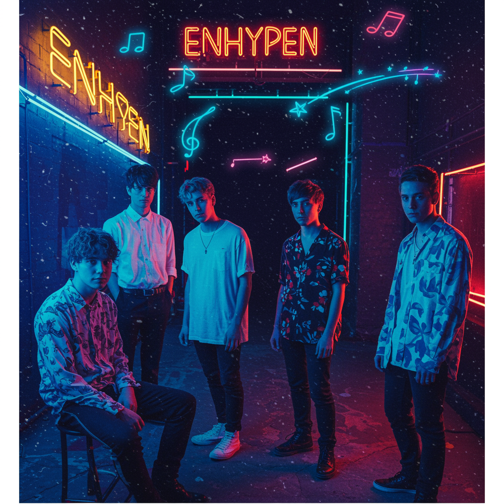 A dynamic and colorful representation of Enhypen, with vibrant neon lights casting a playful glow, featuring the band members in a futuristic setting that merges urban street style with celestial elements, where each member exudes charisma surrounded by constellations and musical notes that float like shooting stars, capturing their energy, unity, and the dreamlike quality of their music in a single captivating image perfect for a profile picture.