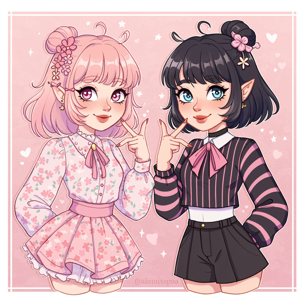 A vibrant digital illustration of two femboy characters with soft, pastel hues and anime-inspired features, each embodying their own unique style, one adorned in delicate floral patterns and the other in sleek, modern stripes; both sporting playful expressions that capture a sense of whimsical charm and companionship, perfectly aligned to form a seamless duo for matching profile pictures.