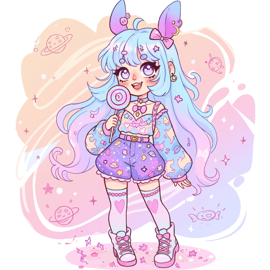 A whimsical cartoon girl with large, expressive eyes and flowing pastel hair stands against a backdrop of playful, abstract shapes. Her outfit is a vibrant blend of eclectic patterns, featuring a quirky mix of colors inspired by candy, cosmic elements, and nature. She holds an oversized lollipop in one hand, and her infectious smile radiates a sense of adventure and mischief. Playful celestial motifs, like small floating planets and stars, surround her, adding a dreamy touch to this vibrant cartoon world. This image embodies a sense of fun, spontaneity, and creativity, making it the perfect representation for a captivating profile picture.