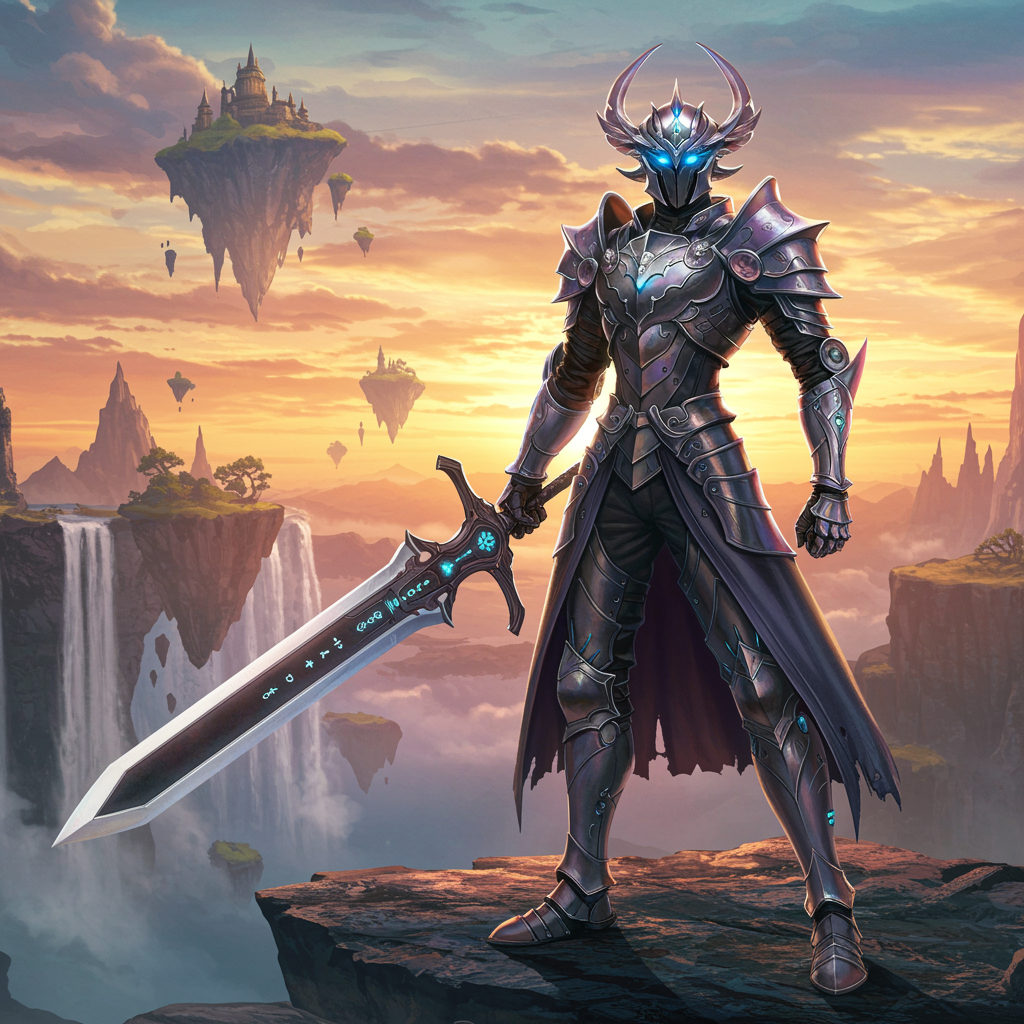 Imagine a futuristic warrior standing atop a jagged cliff, with cascading waterfalls and floating islands in the background. The warrior's armor is a fusion of sleek metallic technology and ethereal magic, shimmering in iridescent hues. Their piercing blue eyes glow with mystical energy beneath an intricate helmet adorned with glowing runes. In their hand, they hold a large, ornate sword, its blade radiating a soft, otherworldly light. The sky behind them is an intense blend of vibrant sunset colors, casting dramatic shadows and highlights across their determined visage. This striking scene embodies the essence of a captivating "final fantasy pfp," exuding a sense of adventure, mysticism, and heroic resolve.