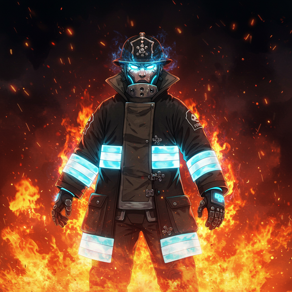 A stunningly vibrant profile picture captures a futuristic firefighter from the animated world of "Fire Force," clad in a sleek suit that glows with iridescent blue lines. The character stands heroically amidst swirling flames, their eyes reflecting a fierce determination that mirrors the inferno around them. In the background, embers drift like stars in a night sky, casting a fiery aura that highlights the figure's silhouette, creating a powerful and dynamic image that embodies the essence of both bravery and mystical fire control.