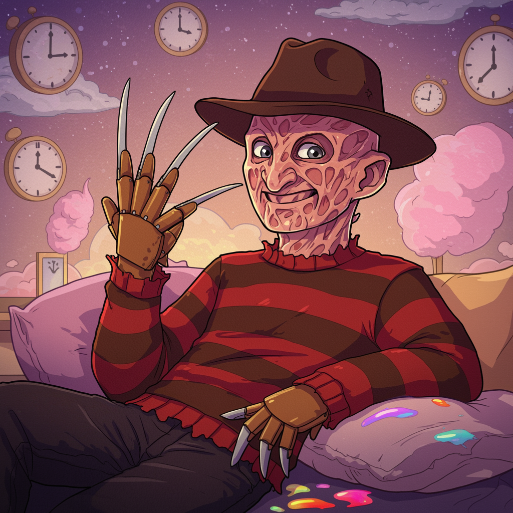 "Imagine a cartoon-inspired Freddy Krueger with a whimsical twist, dressed in a vibrant, mischievously colorful sweater, lounging in a cozy, surreal dreamscape environment filled with floating clocks and cotton candy clouds, his iconic glove transformed into playful paintbrushes dripping with bright neon paint, casting a friendly but enigmatic smile that invites curiosity and wonder, perfect for a fun and quirky social media profile picture."