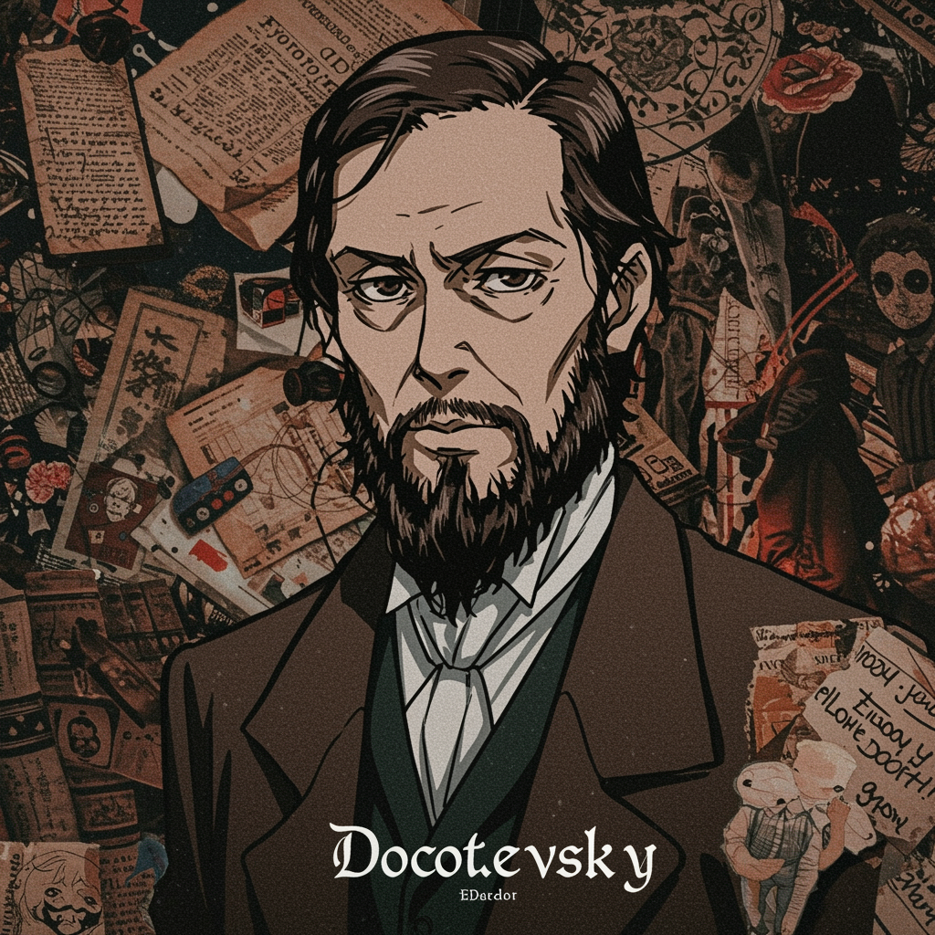 A moody, artistic depiction of Fyodor Dostoevsky from "Bungo Stray Dogs," captured as a profile picture, blending his enigmatic aura with a playful modern twist—his piercing eyes reflecting the intensity of his intellect, framed by swirling abstract shadows that hint at his mysterious literary genius, all set against a backdrop of surreal dreamlike elements inspired by his famous works.