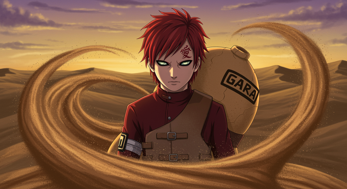 Imagine a striking pfp image featuring Gaara from the world of Naruto, captured in an ethereal desert landscape during twilight; his iconic sand swirling around him in an intricate dance, forming mystical patterns that reflect his inner tranquility and strength. His fierce yet calm gaze is highlighted by the soft glint of the setting sun, while the gentle whisper of the wind carries grains of sand that seem to sparkle like tiny stars. The background shows distant dunes, casting elongated shadows, under a sky painted with hues of violet and gold, creating an atmosphere that blends serenity and power, perfectly encapsulating Gaara's complex character.