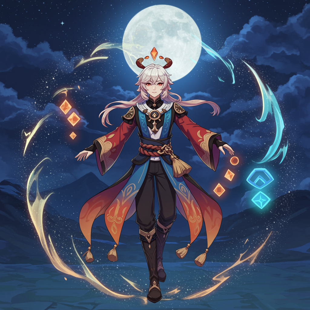 A mystical character adorned in vibrant, flowing elemental robes stands amidst a swirling aura of glowing Anemo and Geo energy, their striking features illuminated by the shimmering glow of a full moon, capturing both the ethereal beauty and enigmatic demeanor of a Genshin Impact hero, ready to embark on an epic adventure.