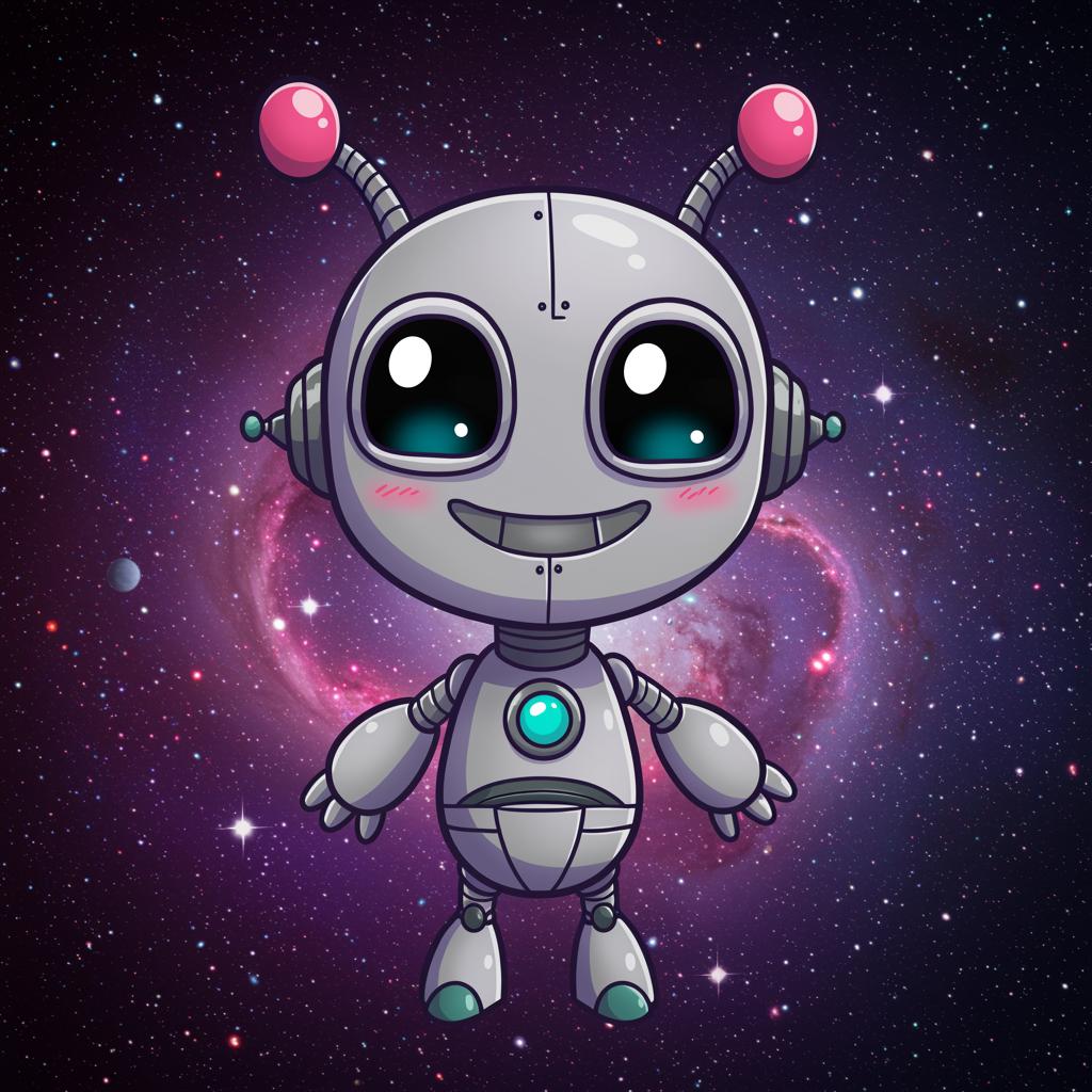 A whimsical and vibrant image featuring an adorable, robotic alien with a mischievous grin, sporting oversized, expressive eyes and quirky antennas, set against a cosmic backdrop filled with swirling galaxies and twinkling stars, embodying a playful and otherworldly charm that makes for a perfect "gir pfp."