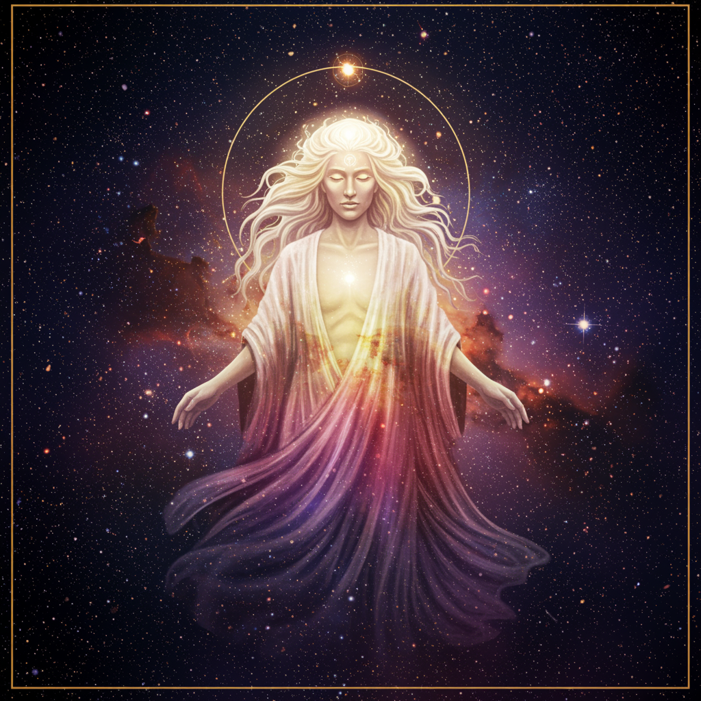 A celestial figure with an ethereal glow stands at the center of a cosmic tapestry, their robes swirling like galaxies; their eyes holding the essence of ancient wisdom, and a serene smile that hints at secrets of the universe, against a backdrop of twinkling stars and nebulae that seem to whisper forgotten myths.