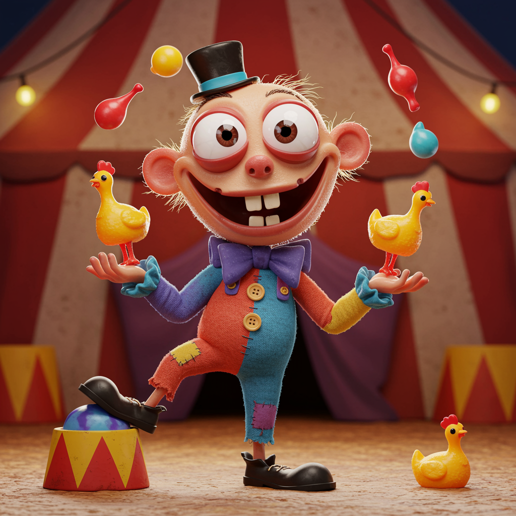 Create a whimsical cartoon character with exaggerated features like oversized googly eyes, a crooked smile displaying a missing tooth, and mismatched rainbow-colored clothes; the character should be playfully juggling rubber chickens while standing on one leg, with a vibrant circus tent in the background, exuding a sense of carefree chaos perfect for a "goofy ah pfp".