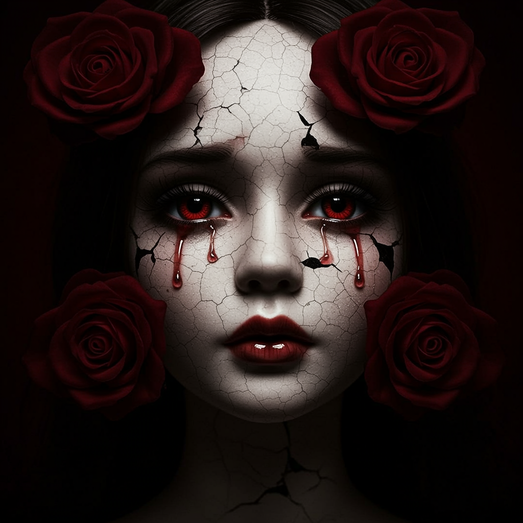 A hauntingly beautiful profile picture capturing a delicate porcelain doll with a cracked face, where vivid red roses bloom from each fracture, juxtaposing beauty and decay; her eyes, silently weeping crimson tears, display a sense of haunting allure and a hint of enigmatic darkness, enveloped in a shadowy aura that dances with spectral whispers.