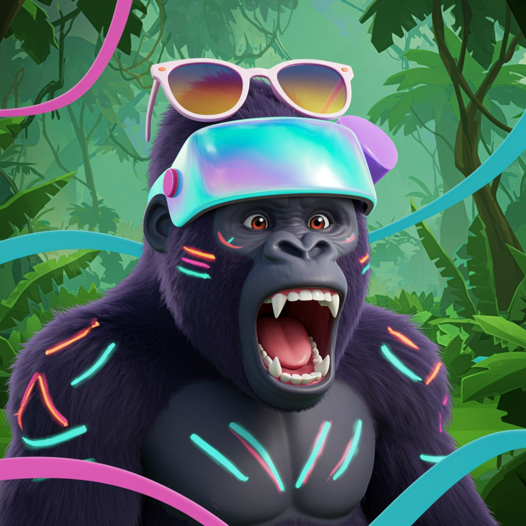 A vibrant and playful profile picture featuring a gorilla from the virtual reality game "Gorilla Tag," adorned with an eclectic assortment of cosmetics. The gorilla, with an expression of wild excitement, is adorned with a shimmering, holographic visor, bright neon body paint in geometric patterns, and oversized, playful sunglasses perched atop its head. In the background, virtual jungles blend with abstract digital elements, echoing a world that merges reality and imagination. Lush, pixelated trees sway gently, while playful ribbons of binary code wrap around the gorilla, creating a fusion of nature and technology. This image captures both the thrilling energy of the game and the personalized flair of player expression, making it the perfect representation of a unique and dynamic social media profile picture.