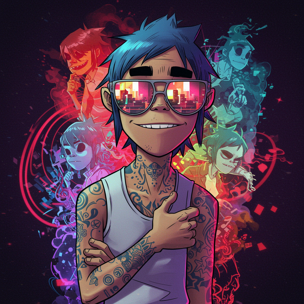A vibrant and surreal profile picture capturing the essence of Gorillaz with a futuristic twist; imagine an animated collage featuring a charismatic, graffiti-styled avatar with intricate tattoos, wearing retro-futuristic sunglasses that reflect a neon-lit cityscape. The character stands against a backdrop of swirling abstract patterns inspired by the Gorillaz aesthetic, with subtle nods to virtual band elements like musical notes morphing into digital pixels and ethereal mist that forms into spectral band members, creating an enigmatic and edgy presence perfect for a pfp.