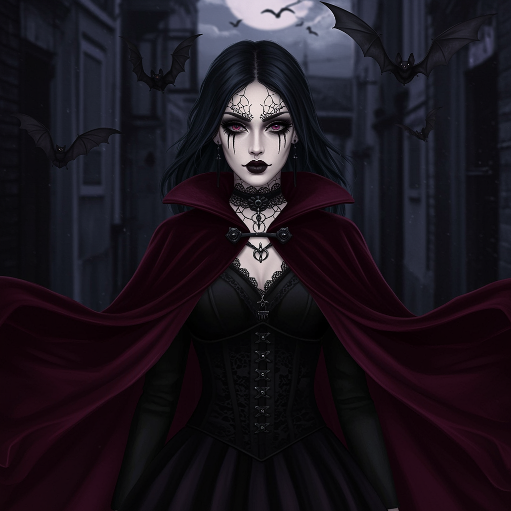In a dimly lit, moonlit alley draped in shadows, stands a mysterious figure exuding an aura of gothic elegance. Their porcelain skin is adorned with intricate black lace patterns that resemble delicate spider webs. Dark, kohl-lined eyes glisten like obsidian beneath the raven's wing of their sleek, flowing hair. They wear an elaborate, velvety cloak that ripples gently in the twilight breeze, revealing hints of deep crimson underneath. This enchanting soul is flanked by ethereal bats with wings that shimmer like twilight stars, their presence enhancing the enigmatic allure. The mood is one of alluring darkness, fantasy, and rebellion, capturing the perfect essence of a goth anime-inspired profile picture.