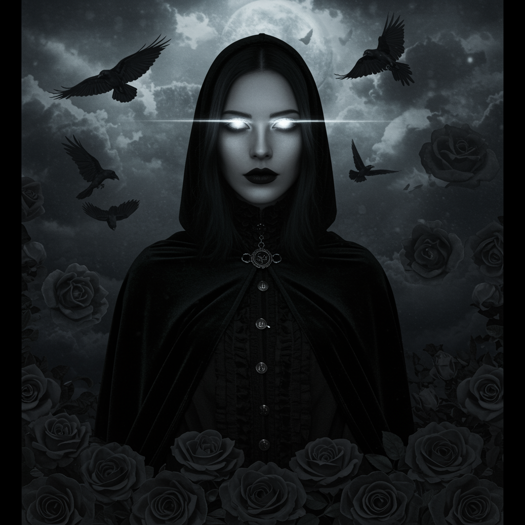 A mysterious gothic pfp featuring a shadowy figure in an intricately detailed victorian-style velvet cloak, standing against the backdrop of a stormy sky, moonlight casting an ethereal silver beam across their eyes, which glow with an enigmatic luminescence, surrounded by swirling black roses and ravens in flight, embodying an aura of dark elegance and intrigue.