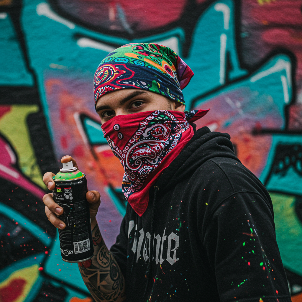 An urban street artist with a spray can in hand is captured mid-motion against a backdrop of vibrant graffiti, their face partially concealed by a colorful bandana, the swirling hues of the mural behind them reflecting a sense of bold self-expression and creativity, while hints of neon paint splatter add an energetic flair to the scene, encapsulating the essence of rebellious artistry and individuality within the small confines of a social media profile picture.
