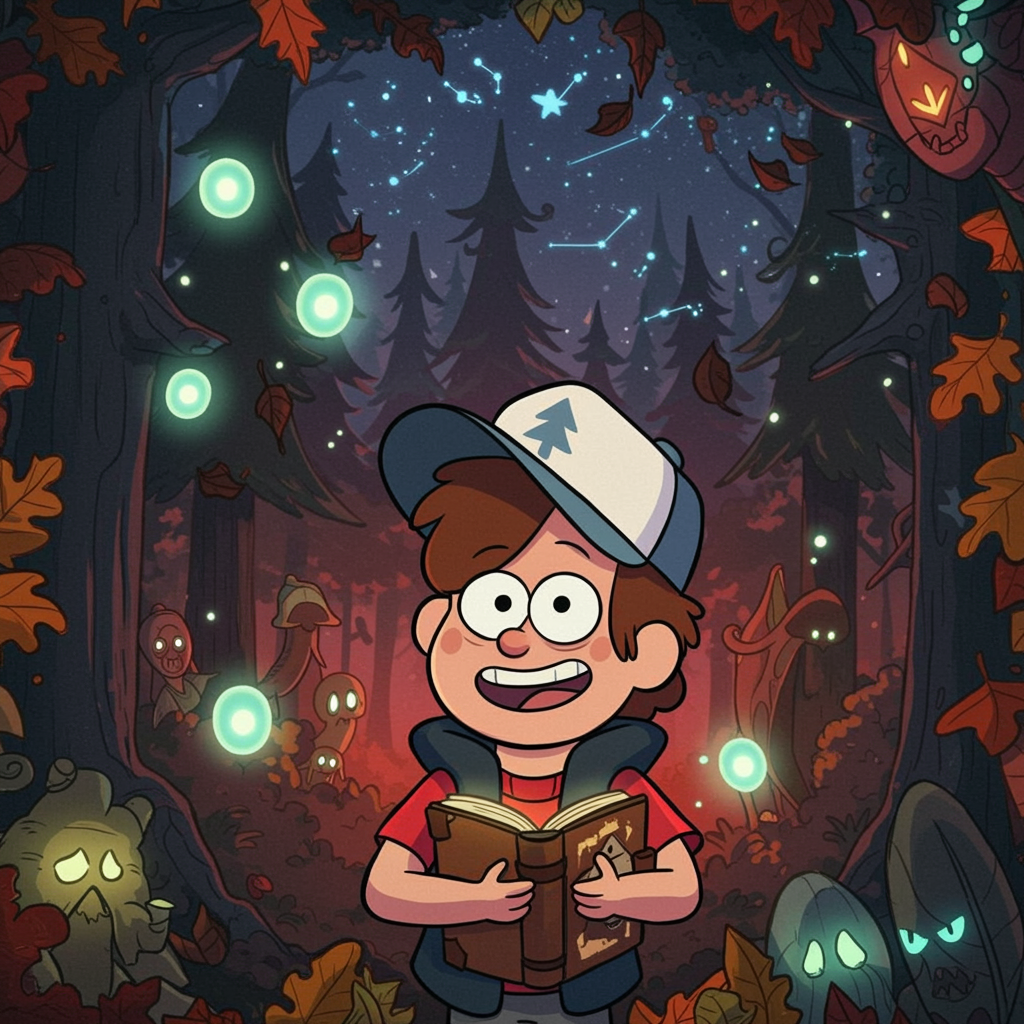 Imagine a whimsical collage capturing the essence of a Gravity Falls-inspired profile picture: a mystical forest background bathed in the enchanting glow of twilight, dotted with floating luminescent orbs and shadowy silhouettes of mysterious creatures lurking in the distance; prominently in the foreground, the main focal point is a young explorer with a mischievous grin and wide-eyed wonder, donning a red and silver baseball cap with a cryptic symbol, clutching a journal filled with cryptic sketches and unraveling secrets; the air around is charged with magic as autumn leaves swirl playfully and cryptids peek from behind trees, all set beneath a sky filled with constellations that subtly resemble familiar shapes from the series, tying in elements of curiosity, mystery, and adventure.