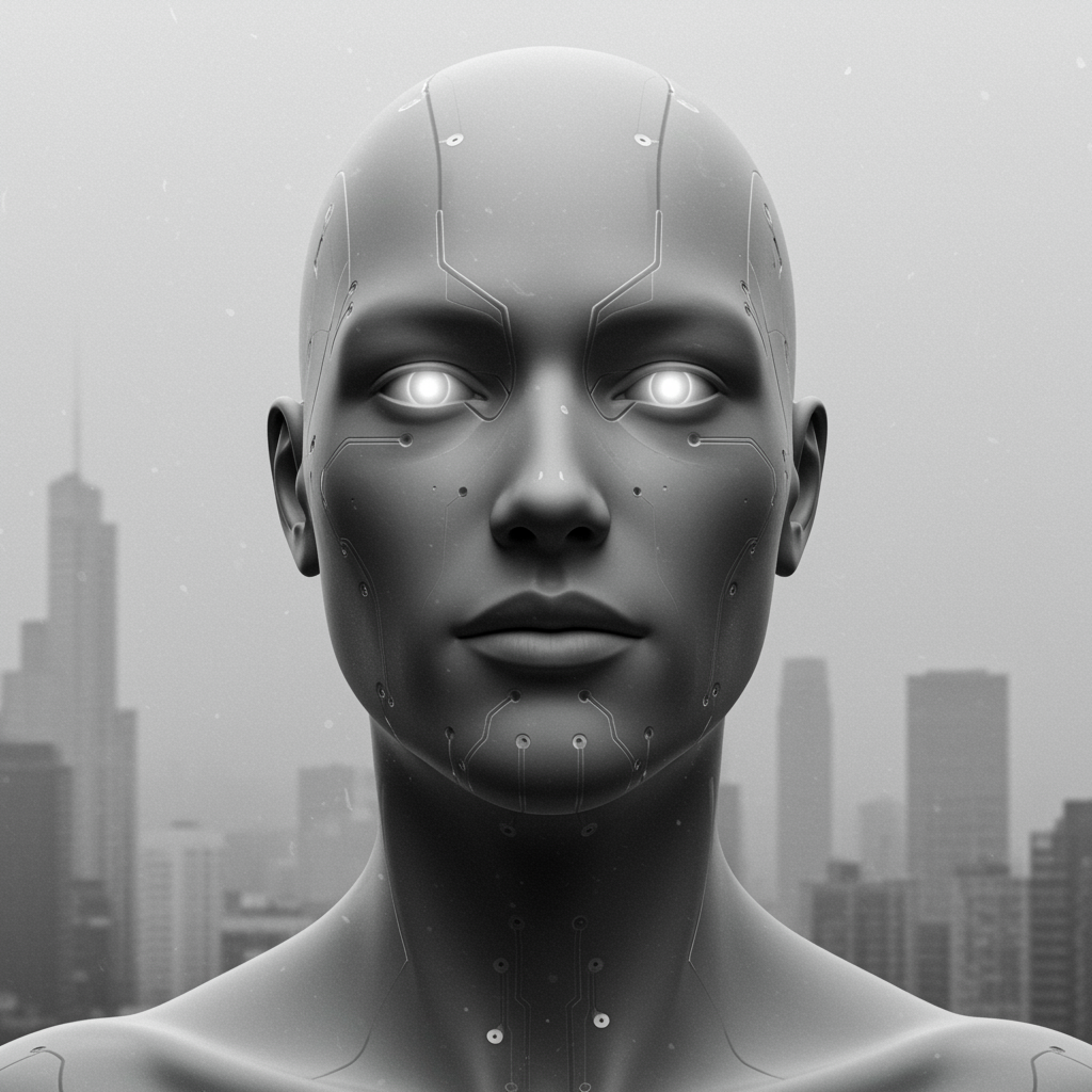 Imagine a sleek, monochromatic portrait of a futuristic, gray-scaled android with glowing silver eyes, surrounded by a misty urban skyline. Its expression is both enigmatic and inviting, embodying an aura of calm intelligence. The android's metallic skin reflects a subtle gradient of grays, and intricate digital patterns dance across its surface like whispers of circuit paths. This avatar's presence is both captivatingly serene and intriguingly complex, ideal for a social media profile picture that suggests depth, modernity, and a touch of mystery.