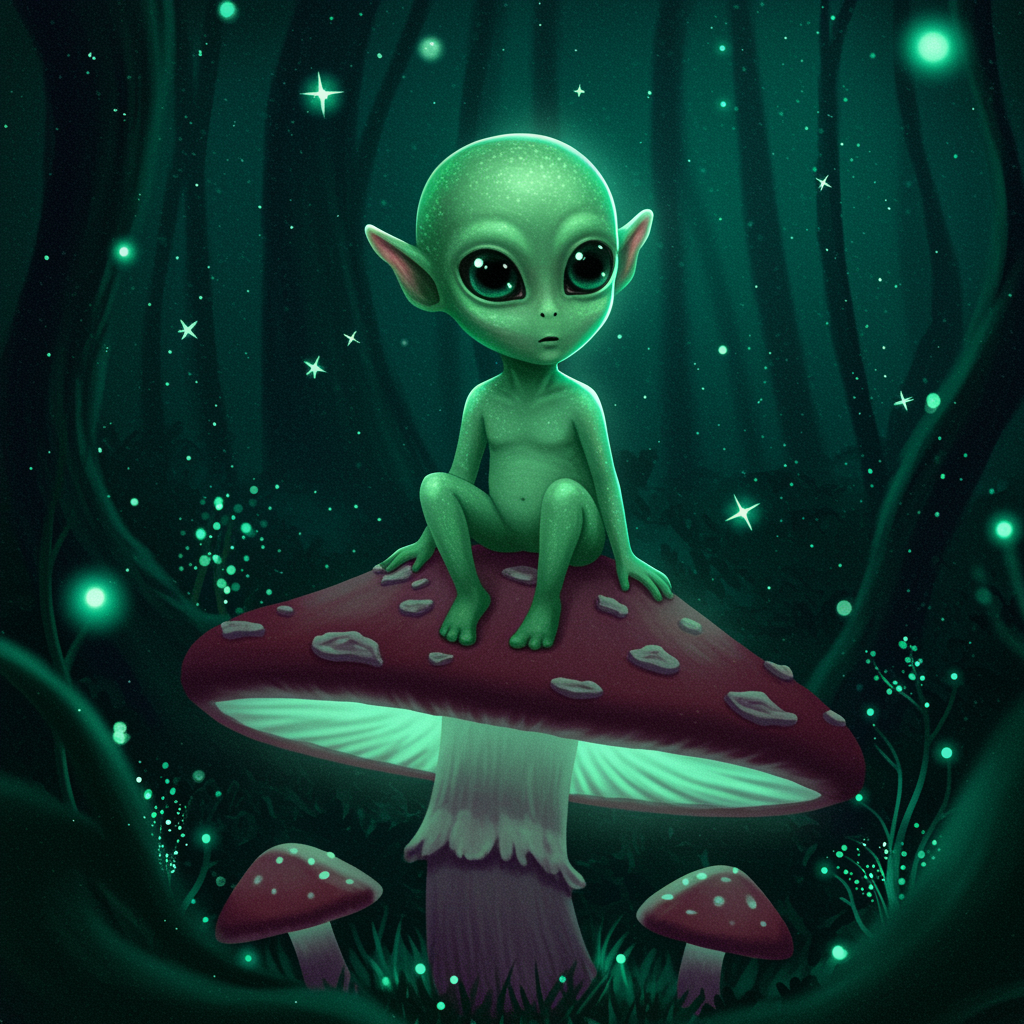 An otherworldly green alien with iridescent skin and large, expressive eyes sits peacefully atop a moonlit mushroom in a cosmic forest, surrounded by twinkling stars and bioluminescent flora; its aura emits a soft, emerald glow that hints at its gentle and curious nature, creating a captivating yet approachable visage perfect for an avatar that symbolizes the mysteries and wonders of the universe.