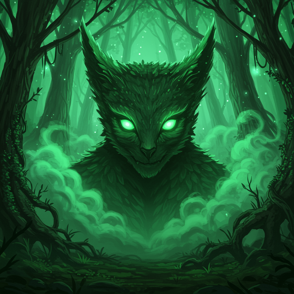A digital artwork showcasing a mystical forest creature with glowing green eyes, enveloped in swirling emerald mist, set against a backdrop of towering ancient trees with luminescent vines, capturing an aura of mystery and intrigue perfectly embodying a green-themed discord profile picture.