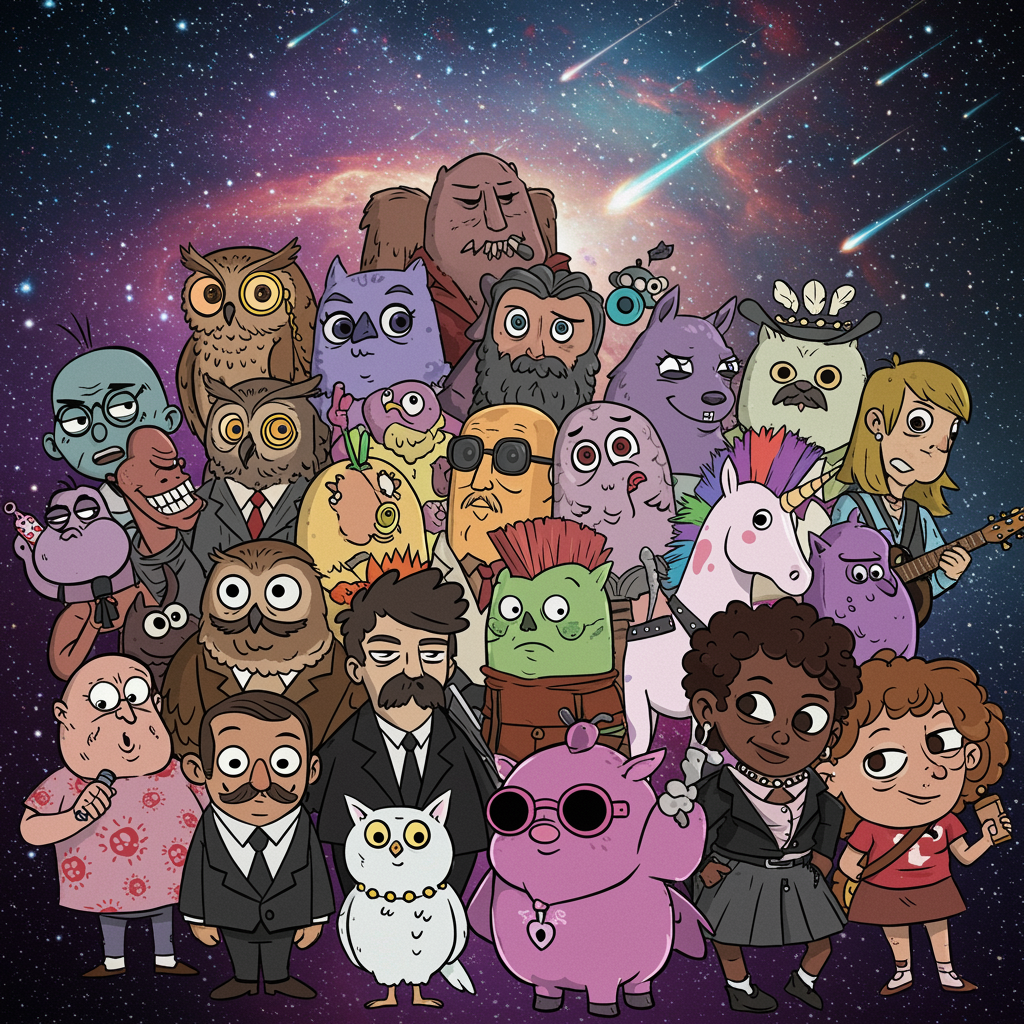 A whimsical collage capturing a vibrant array of personalities, where an eclectic group of animated characters—ranging from a dapper owl in a monocle to a punk rock unicorn with a rainbow mane—are clustered together, each adding their individual flair, against a surreal cosmic backdrop filled with swirling galaxies and shooting stars, forming a dynamic scene that perfectly encapsulates the unity and diversity of a shared online presence.