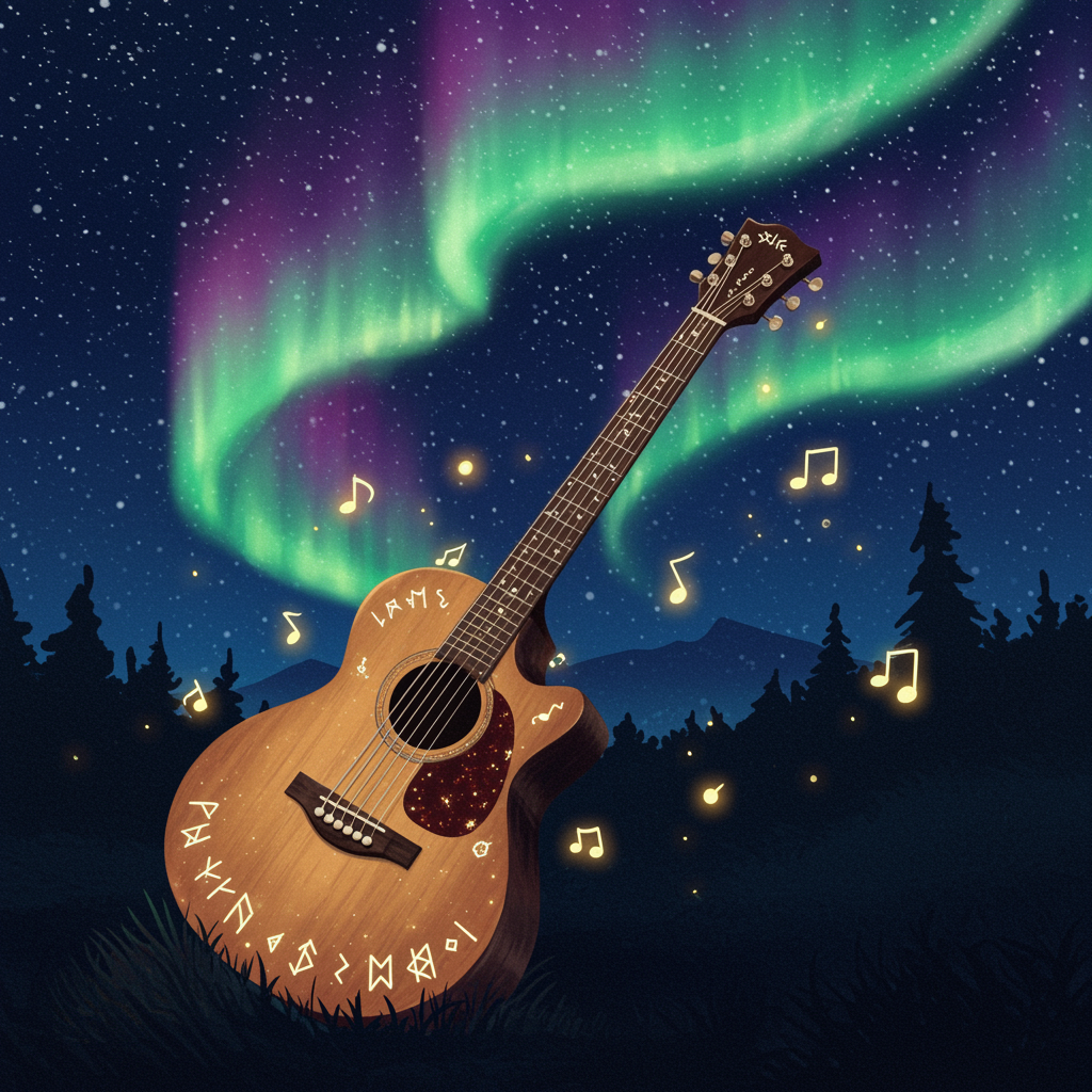 A whimsical profile picture featuring an ethereal guitar with strings made of shimmering stardust, resting under a sky painted with vibrant auroras; the guitar's body is intricately carved with mystical runes that glow softly, and tiny musical notes float around like fireflies, while in the background, a silhouette of a mystical landscape invites the viewer into a dreamlike world.