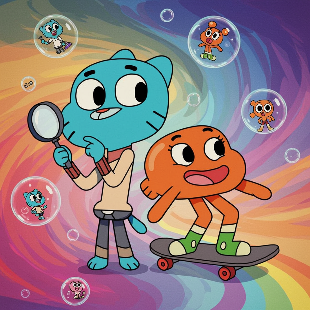 A vibrant and whimsical profile picture featuring the playful duo Gumball and Darwin from "The Amazing World of Gumball," standing back-to-back with mischievous grins. Gumball, the blue cat, sports a thoughtful expression, holding a magnifying glass that reflects the cosmos, while Darwin, the orange fish with legs, balances on a skateboard gliding over a rainbow path. They are surrounded by floating bubbles containing miniature versions of their friends, and the backdrop is a swirl of vivid colors representing their imaginative adventures, blending surrealism with a touch of cartoon charm.