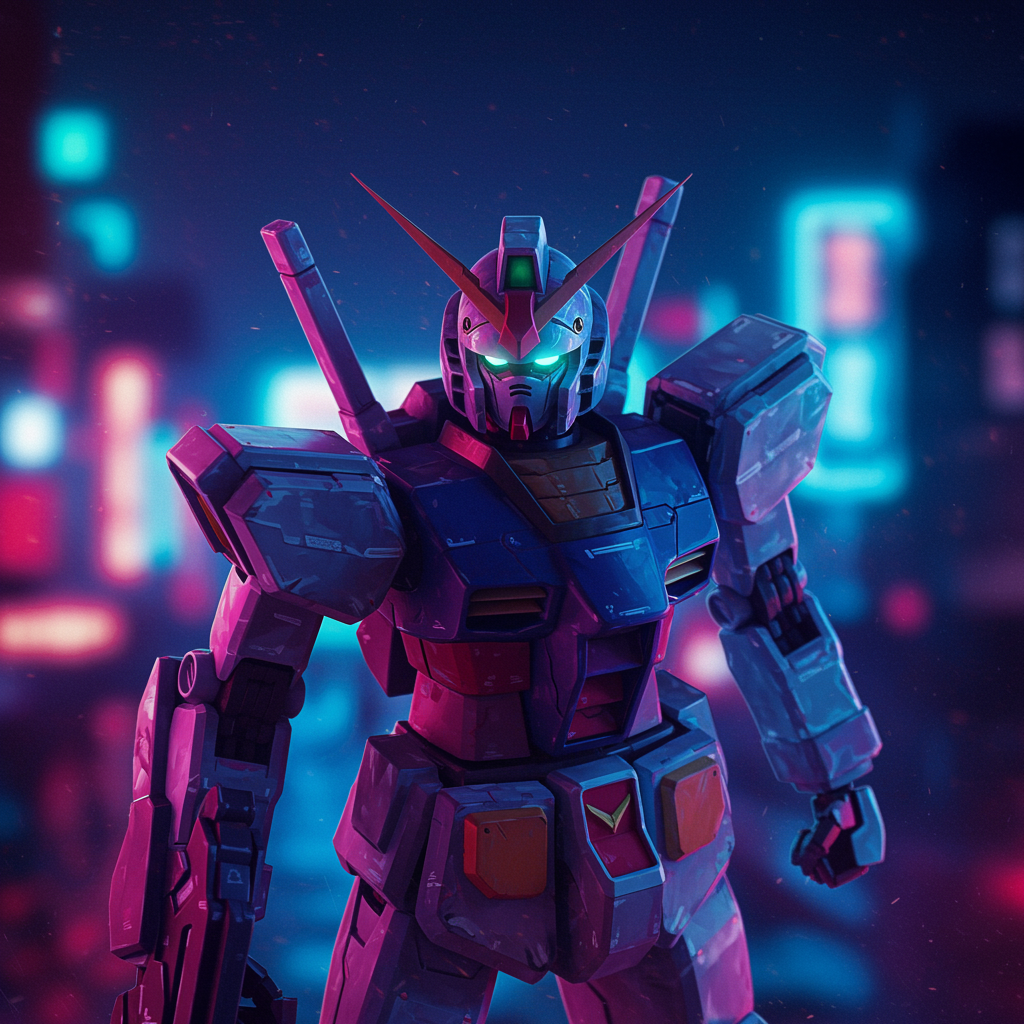 A dynamic and futuristic profile picture featuring a sleek, vibrant gundam standing poised against a neon-lit cityscape backdrop, its metallic armor reflecting the kaleidoscope of city lights while its eyes emit a soft, otherworldly glow, exuding both power and mystery, capturing the essence of a tech-savvy warrior in a world where technology and imagination intertwine seamlessly.