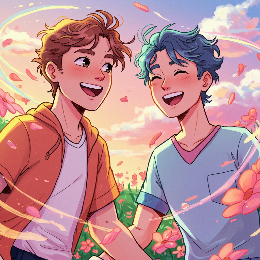 A vibrant, digital illustration of two animated male characters sharing a moment of connection and joy, each with windswept hair and warm smiles, surrounded by swirling pastel colors and blooming flowers, capturing the essence of friendship and young love in a whimsical, heartwarming style reminiscent of a graphic novel scene, perfectly embodying the spirit of "heartstopper pfp".