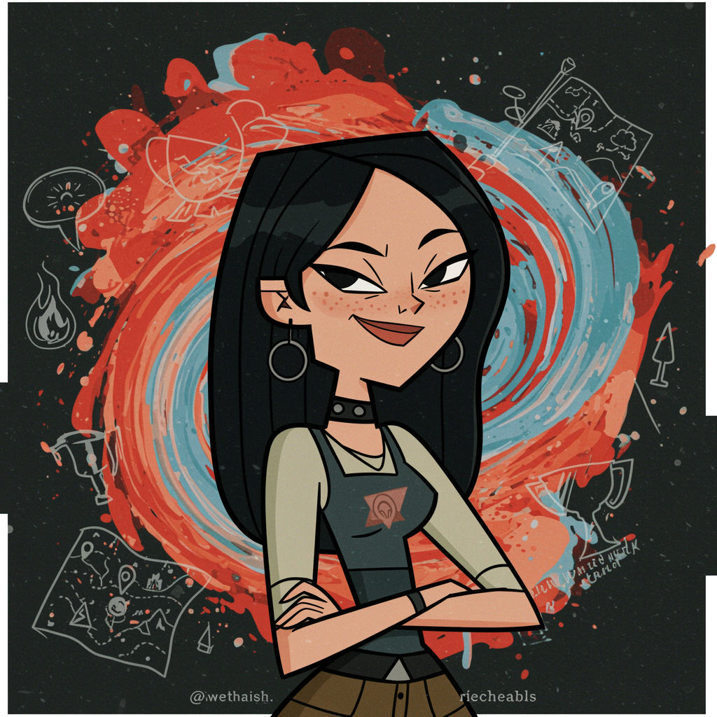 A modern and edgy digital portrait of Heather from Total Drama, striking a confident and mischievous pose with her signature raven-black hair perfectly styled. Her expression is charismatic and slightly smug, capturing her competitive nature. The background is an abstract swirl of vibrant colors, reminiscent of the high-energy drama of the show, incorporating elements like subtle outlines of campfires, maps, and a trophy to symbolize her strategic gameplay. Stylish and cool, this profile picture exudes Heather's bold personality, appealing to fans of animated adventure.