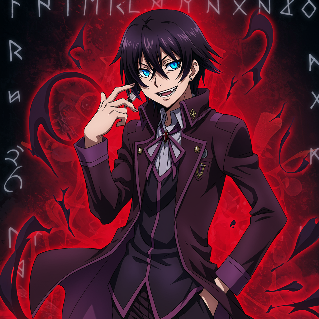 An enchanting high school dxd pfp captures the essence of a charismatic anime character, blending vibrant hues of crimson red and midnight black against a backdrop of mystical runes. Their eyes, a hypnotic electric blue, glimmer with a mischievous spark, hinting at untold powers. Cascading raven locks frame a mischievous grin, while the character's pose exudes a playful confidence, standing amidst swirling ethereal energies. The scene is further accentuated by subtle, mysterious alchemical symbols glowing softly in the background, enveloping the character in an aura of intrigue and allure.
