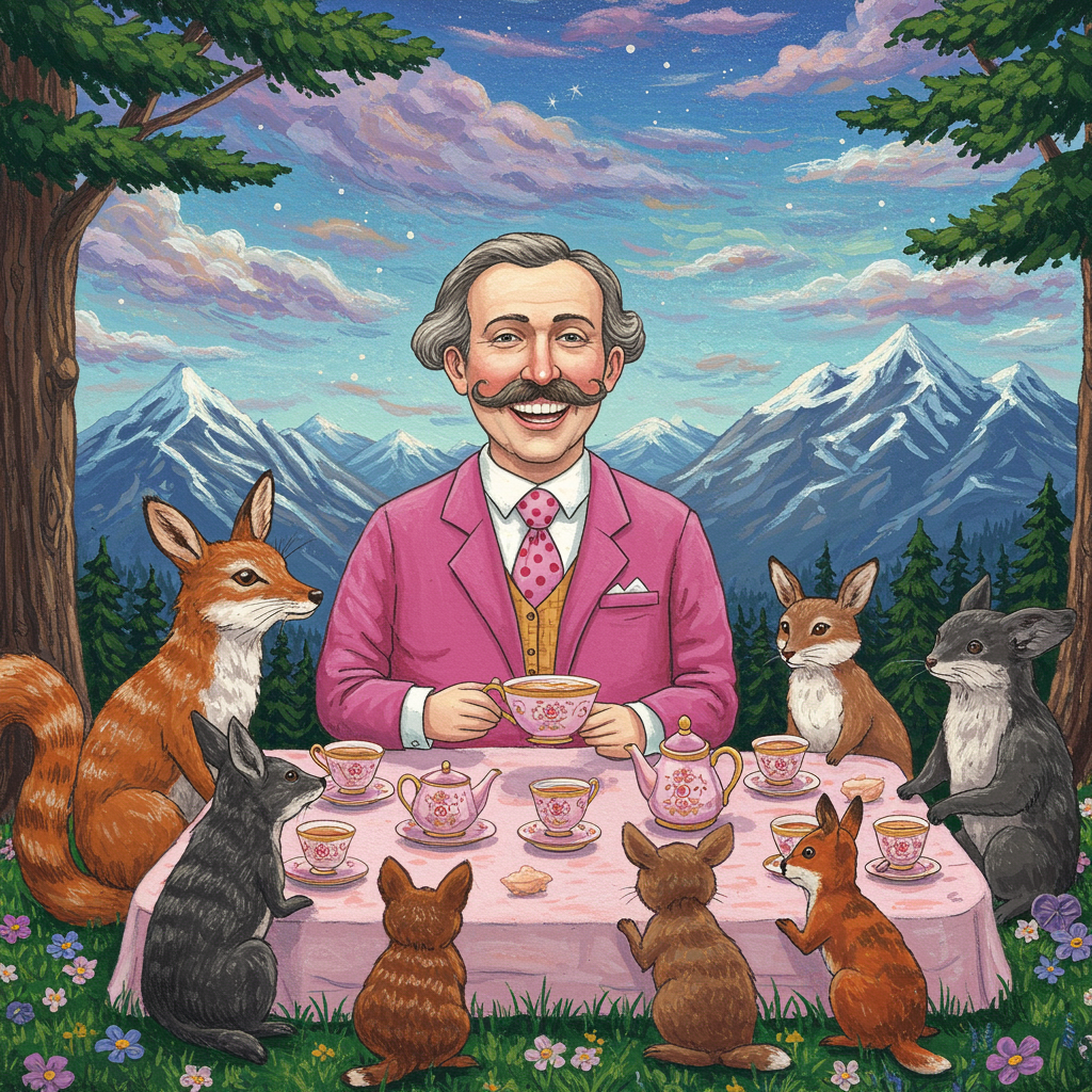 A whimsical depiction of a serene mountaintop tea party in an alternate universe where historical figures are transformed into cartoonish, non-controversial characters; a jovial and mustachioed man with an exaggerated smile, wearing a bright pink suit and polka-dot tie, enjoys a cup of imaginary tea alongside a group of woodland creatures under a sky painted with vibrant, swirling colors reminiscent of a daydream.