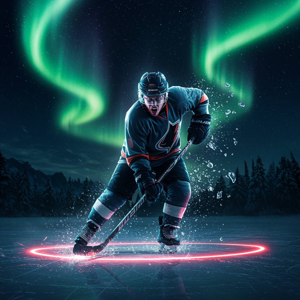 An electrifying image of a fierce, futuristic hockey player mid-action, skating on a neon-glowing ice rink under a swirling aurora borealis; the player is wearing a sleek, custom-designed helmet with their team's emblem glowing in the dark. Their intense eyes reflect determination and intensity, as flashes of light from the night sky illuminate the icy shards flying up from their skates. The background is an ethereal blend of modern cityscape and a frozen wilderness, capturing the spirit of both tradition and innovation in the sport.