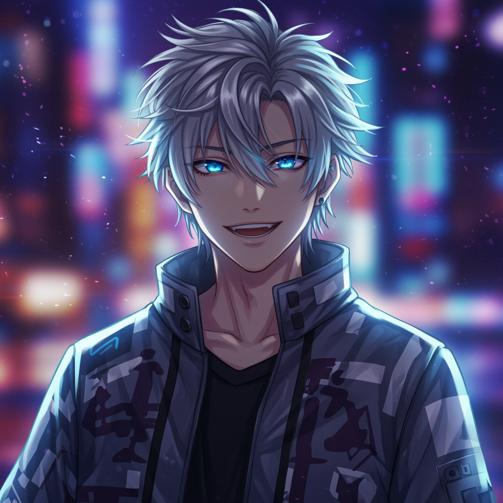 A strikingly handsome anime boy with deep azure eyes that glisten like a summer lake, his tousled silver hair catching the light in a way that suggests mischief and mystery; standing with a confidently playful grin, wearing a sleek modern jacket adorned with abstract patterns that hint at a futuristic world, while an ethereal glow surrounds him, creating an aura of allure and charisma against a backdrop of neon city lights softly blurred to convey a sense of adventure and sophistication.