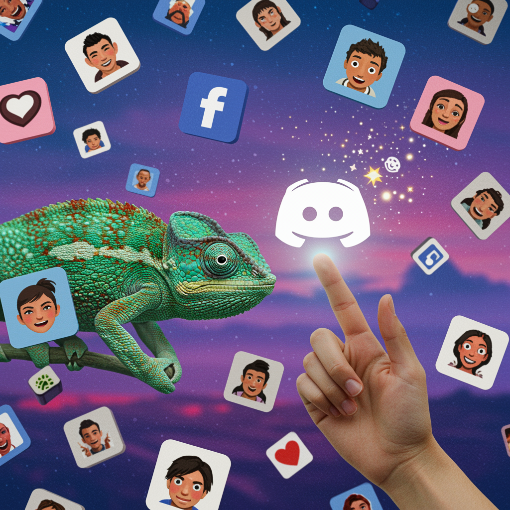 A whimsical collage featuring a chameleon skillfully blending into a vibrant digital landscape filled with floating social media icons, each icon displaying a different profile picture; a finger hovers playfully over a Discord logo, hinting at the impending magic of transformation where every click brings forth a burst of new, expressive avatars reflecting diverse moods and personalities within a pixelated realm.