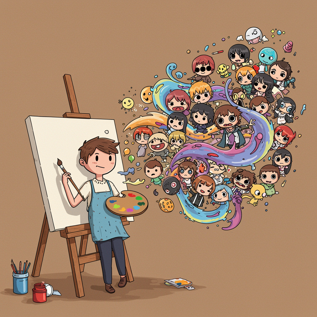 Create a vibrant digital collage featuring a whimsical artist at an easel, painting a canvas that's magically transforming into a myriad of miniature profile pictures, each reflecting diverse styles from pixel art and manga to gothic and surreal, with splashes of color swirling around like visual brainstorming, symbolizing the creative process of designing a unique and captivating pfp.