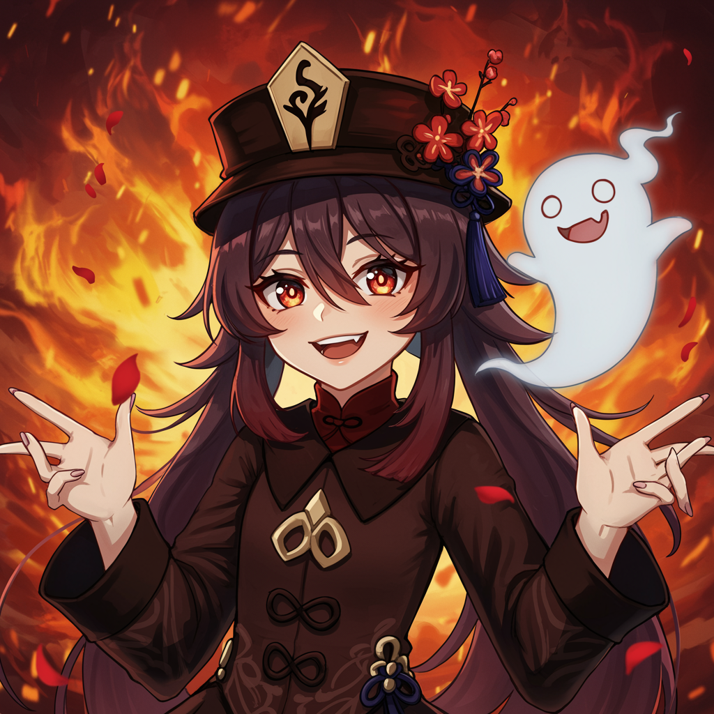 "Imagine a vibrant profile picture capturing the essence of Hu Tao, the enigmatic character from Genshin Impact, set against a backdrop of swirling crimson and amber flames illuminating her mischievous smile. Her hauntingly playful eyes reflect an otherworldly glow, as if she is on the verge of sharing a spirited secret. Her iconic ghostly companion playfully floats nearby, adding a touch of spectral charm to the scene, while crimson petals drift gently in the background, evoking a sense of mysterious allure and spirited adventure."