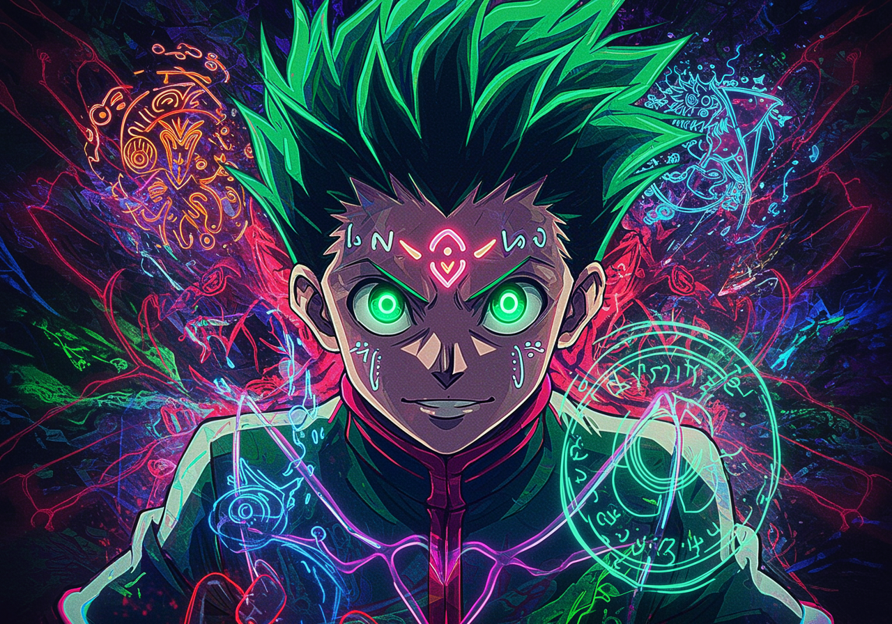 "Envision a dynamic and vibrant profile picture capturing the essence of 'Hunter x Hunter,' featuring a kaleidoscope of neon colors and intricate details. Picture a spirited character with electrifying green hair and intense eyes filled with determination, surrounded by mystical auras and symbols from the Hunter universe. The background is an abstract swirl of nature and energy, representing adventure and the thrill of the hunt, with a subtle nod to the camaraderie and challenges faced by hunters on their quests. This image embodies the allure of mystery and the relentless pursuit of achievement that defines the heart of a true hunter."
