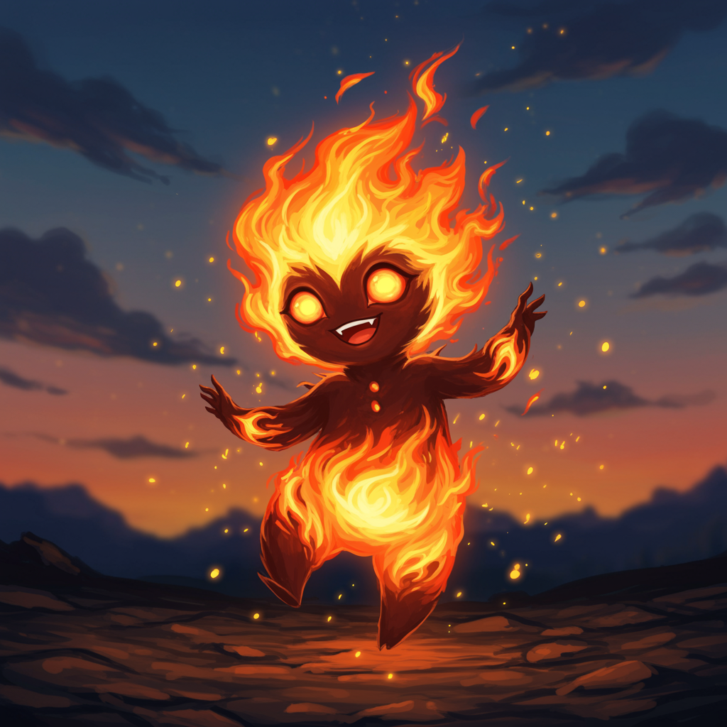 Envision a captivating "huohuo pfp" where a whimsical fire sprite, its form ever-shifting between embers and flame, dances joyfully against a backdrop of a twilight sky. The sprite's eyes are reminiscent of burning coals, exuding warmth and mystery. Surrounding the sprite, glowing sparks hover like tiny fireflies, occasionally bursting into playful patterns. The whole scene is imbued with a sense of ethereal energy, blending excitement with an otherworldly calm, as if the sprite invites you into its enchanting world through the small digital window of your profile picture.