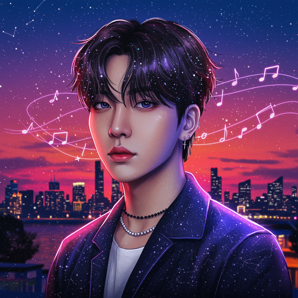 "Create an enchanting digital artwork capturing the charismatic essence of Hyunjin, blending elements of surrealism and vibrant urban aesthetics. The image should depict Hyunjin against a luminous cityscape at twilight, where a cascade of glowing neon lights reflects in his enigmatic eyes. His hair, animated with a gentle breeze, intertwines with abstract musical notes, symbolizing his connection to rhythm and melody. The background should subtly integrate celestial motifs, such as star constellations and a crescent moon, to imbue the portrait with a dreamlike quality, creating an iconic and unforgettable profile picture that speaks to both his artistic persona and modern digital allure."