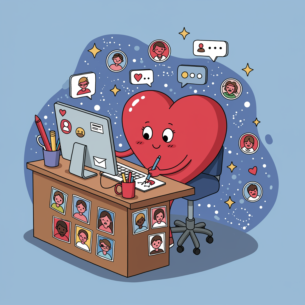 Create an image of a whimsical, cartoon heart character sitting at a computer desk adorned with stickers of tiny avatars, each representing diverse personalities and styles; the heart character is lovingly crafting a custom profile picture collage with various art supplies, surrounded by a galaxy of floating icons like stars and chat bubbles, reflecting the joy and creativity of designing the perfect social media persona.