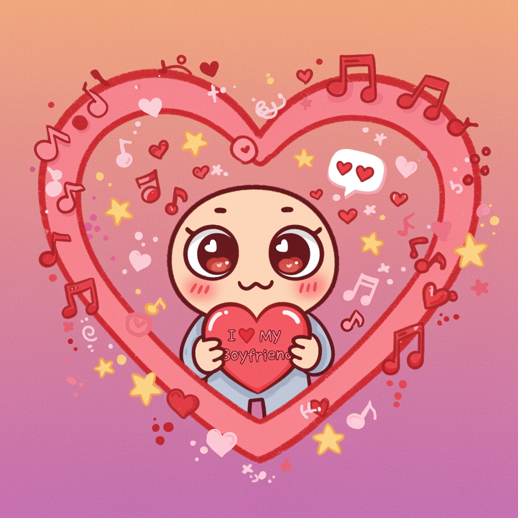 An enchanting digital illustration of a whimsical heart-shaped frame featuring a cartoon-style character with expressive eyes holding a smaller heart inscribed with "I 💖 My Boyfriend" at the center; surrounded by playful elements like stars, music notes, and tiny floating hearts, all set against a vibrant gradient background reflecting warmth and affection, perfect for a lively and loving social media profile picture.