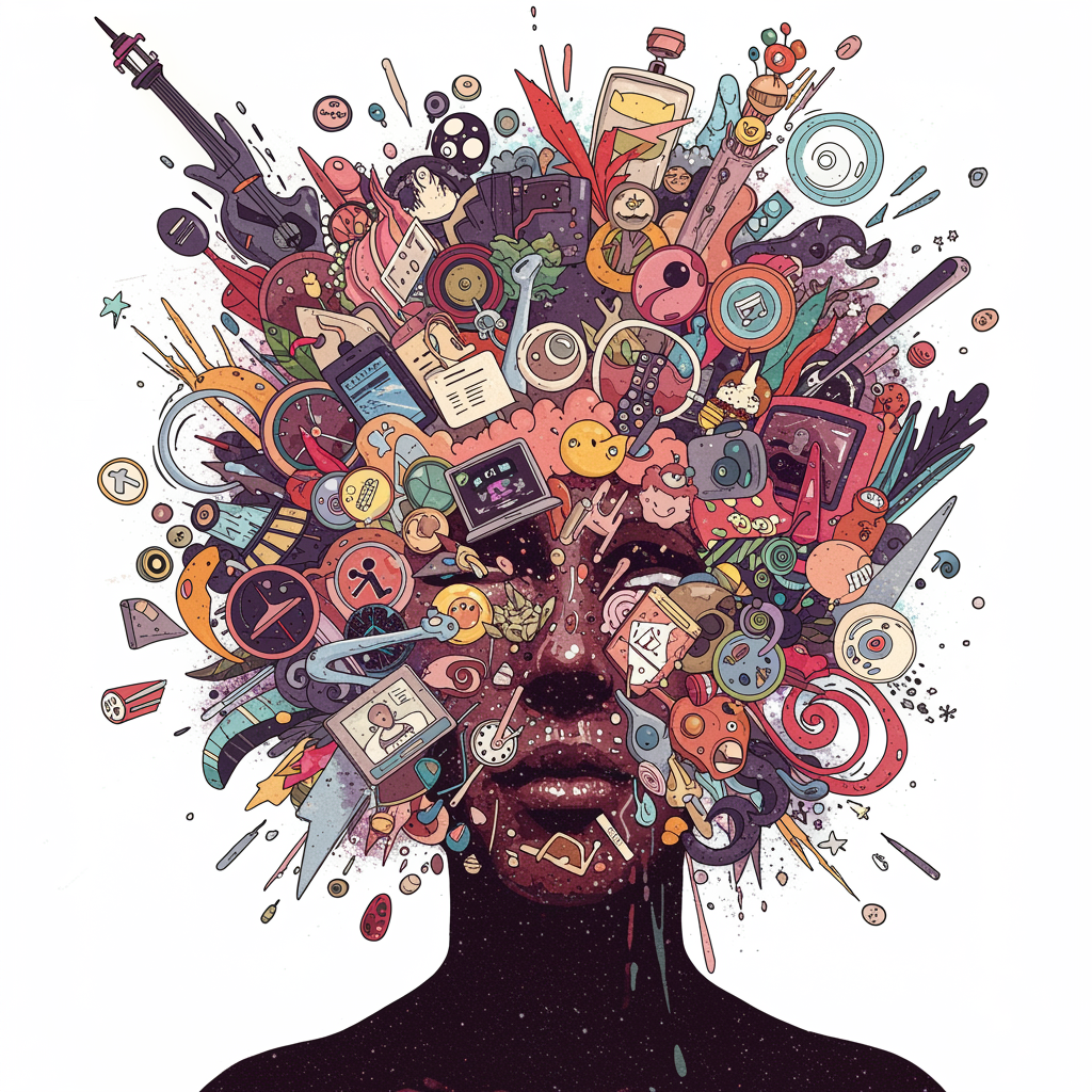 A whimsical fusion of surrealism and pop art featuring a vibrant, kaleidoscopic blend of iconic cultural symbols and abstract shapes swirling around a silhouette of a faceless figure, embodying the essence of individuality and digital identity in a harmonious explosion of color and form.