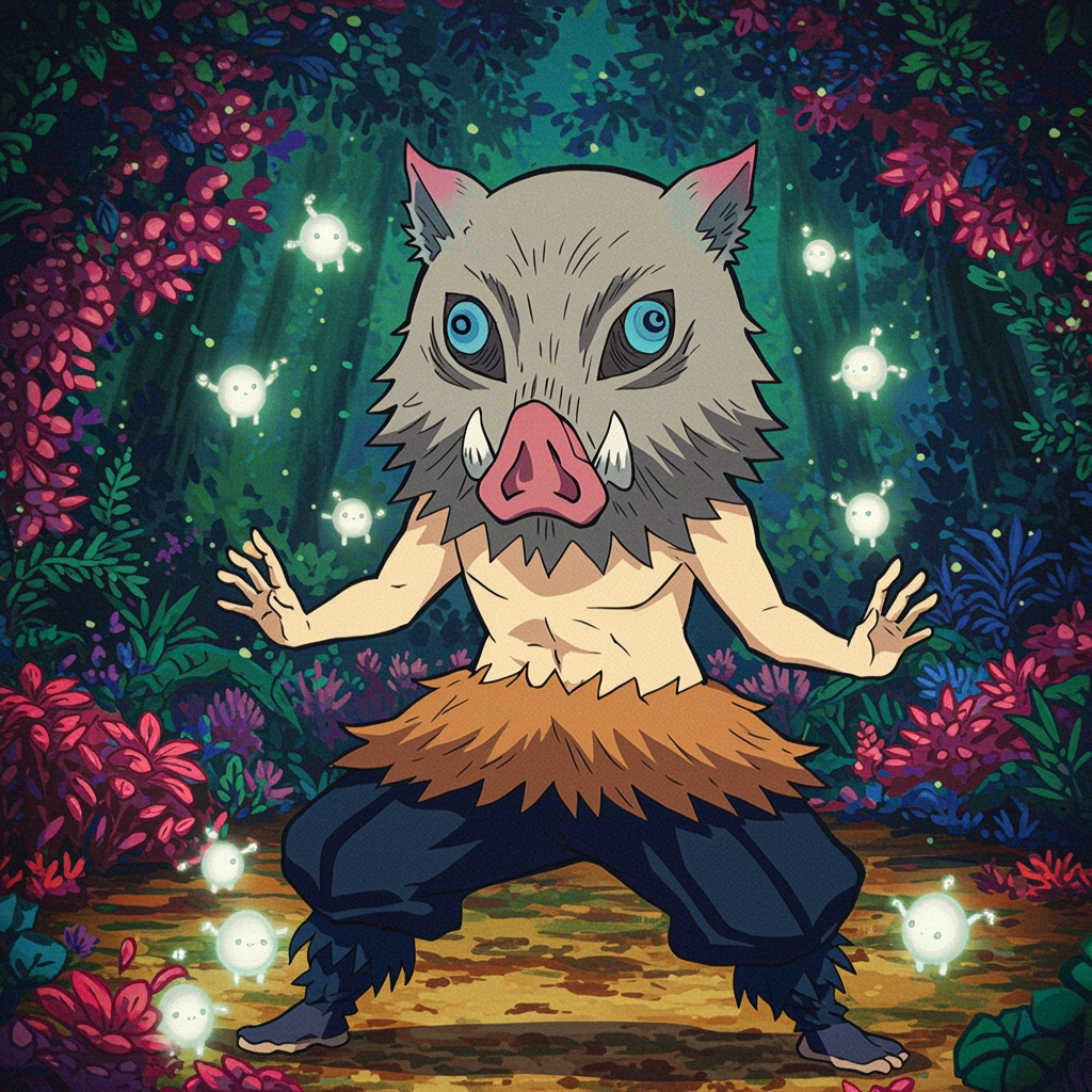 Inosuke pfp prompt: A whimsical profile picture capturing Inosuke Hashibira, from "Demon Slayer," in an imaginative forest setting, surrounded by vibrant, otherworldly flora and tiny, luminescent creatures that dance around him. His iconic boar mask is depicted as intricately detailed with bold colors, and his eyes reflect a mischievous yet determined spirit. The background is a kaleidoscope of swirling hues, suggesting an ethereal world that balances chaos and harmony, embodying the wild and unpredictable nature of Inosuke himself.