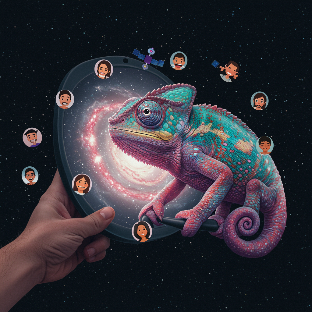 A cosmic chameleon gazes into a galaxy-shaped mirror, its skin shimmering with vibrant nebula patterns, as tiny digital avatars of diverse people orbit around it like satellites, each showcasing a distinct range of emotions; this visual metaphor embodies the endless versatility and connectivity of social media identities captured through the concept of an "insta pfp viewer."