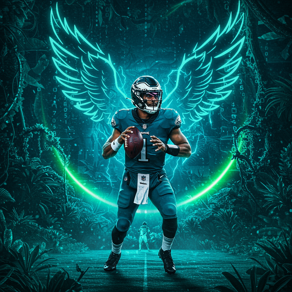 "Envision a dynamic profile picture capturing NFL quarterback Jalen Hurts in an imaginative, surreal landscape where the gridiron transforms into a lush, futuristic jungle; electric blue and neon green hues highlight his intense focus and athletic grace, while subtle symbols of strength and resilience, like phoenix feathers and armor, intertwine with trails of digital code to represent the merging of human spirit and advanced technology in the digital age."