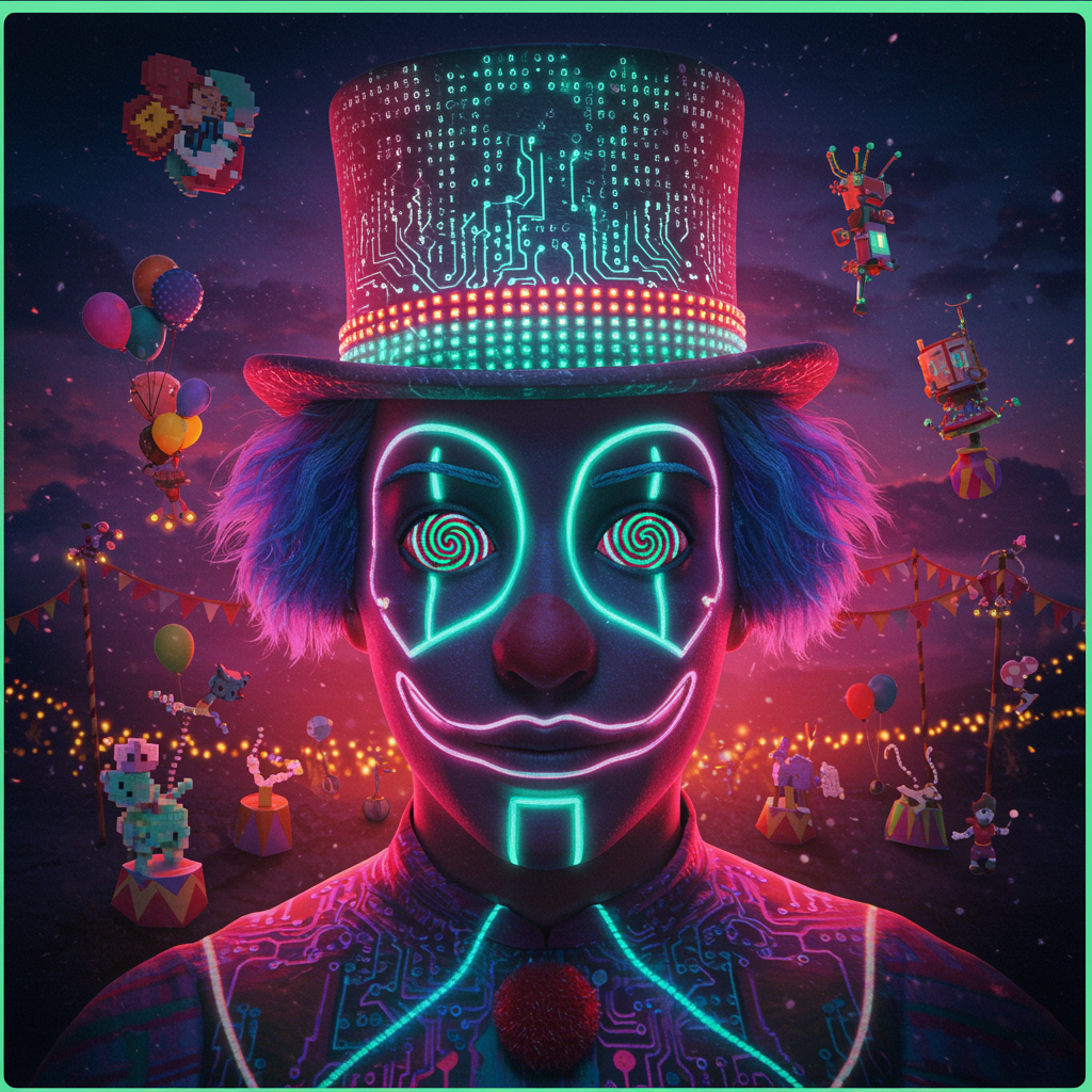 Imagine a vibrant digital circus scene encapsulated within the confines of a profile picture frame, featuring Jax, an enigmatic cyber-clown with neon-painted face. His eyes, like swirling galaxies, are mesmerizing and full of mischief. Jax wears a futuristic, holographic top hat adorned with pulsing LED lights, while his attire is a patchwork of digital circuit patterns that shimmer in a spectrum of colors. In the background, a whimsical array of virtual circus elements floats - pixelated balloons, binary acrobats, and playful algorithmic animals, all set against a twilight sky made of swirling code. The overall atmosphere is one of technological wonder and playful chaos, capturing the surreal essence of a digital circus in a single captivating image.