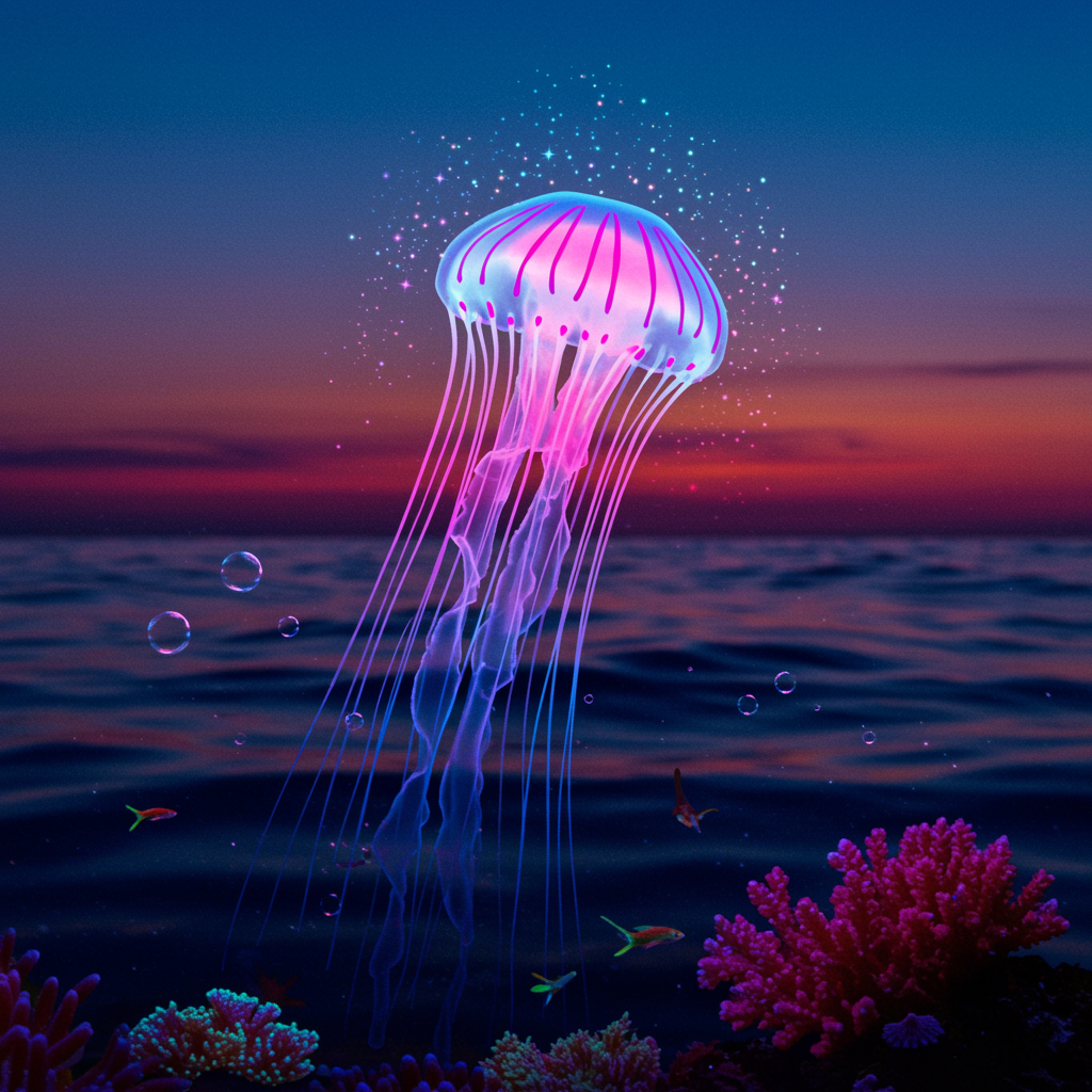 Imagine a whimsical jellyfish gracefully swirling in a twilight sea, its translucent tentacles shimmering with hues of neon pinks, electric blues, and iridescent purples. The jellyfish resembles a mystical crown, each movement leaving a trail of luminescent stardust in the water. Nearby, small bubbles reflect the colors of the sunset, and tiny sea creatures curiously peek from beneath gently swaying corals, adding to the enchanting underwater scene. The jellyfish's ethereal glow reflects the user's vibrant personality, capturing the essence of serene beauty and mysterious allure, perfect for an eye-catching profile picture.