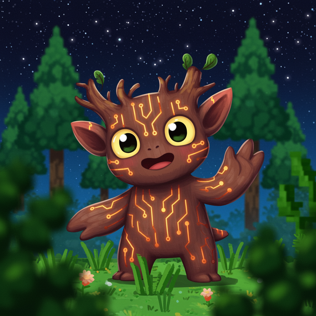 A vibrant and whimsical scene unfolds as a mystical creature reminiscent of a game character emerges from an enchanted forest, its eyes twinkling with curiosity and adventure. The creature's skin is adorned with intricate patterns resembling glowing circuits, symbolizing a fusion of nature and technology. Its playful expression is accented by a mischievous grin, inviting viewers into its fantastical world. In the background, pixelated trees sway gently under a digital sky filled with pixel stars, creating a harmonious blend of the natural and virtual realms, perfect for an intriguing "jogo pfp."