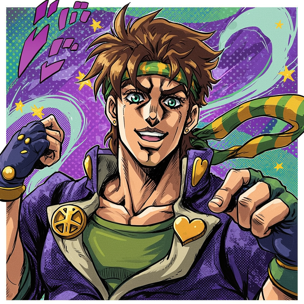 "Imagine a vibrant, dynamic profile picture capturing the essence of Joseph Joestar from JoJo's Bizarre Adventure. The image showcases Joseph in a classic, confident pose, his signature bandana fluttering with a burst of animated energy. His youthful charisma is accentuated by a bright, adventurous background reminiscent of his globe-trotting escapades. Lively, swirling hues of purple and green surround him, echoing the iconic color palette of the series, while subtle hints of comic-book style halftone add a nostalgic touch. The playful gleam in his eyes and his cheeky grin capture his clever, quick-witted personality, creating a captivating piece that represents the spirit of a true adventurer ready to face any challenge."